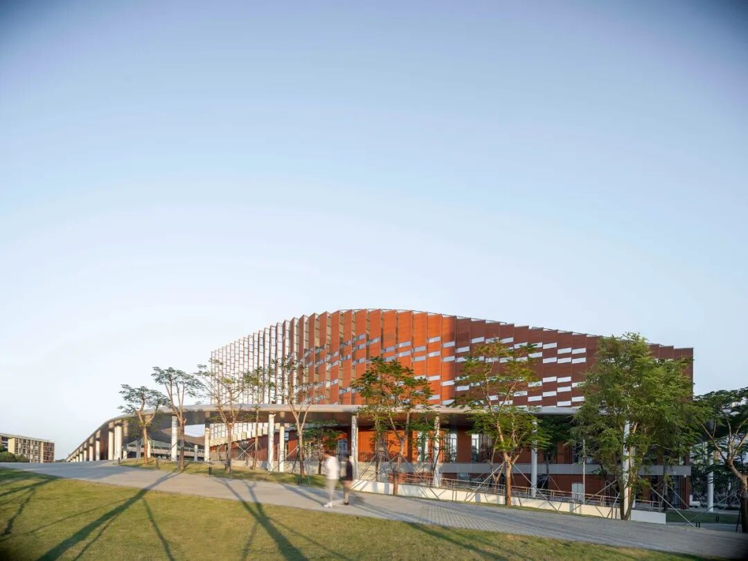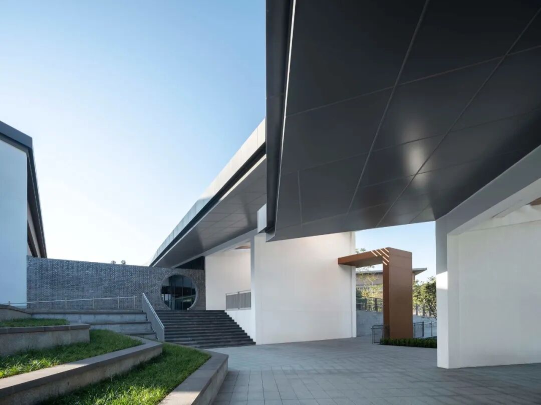 建筑坐北朝南,呈合院式布局在整体形态上呼应了岭南传统建筑的气质。灰砖装饰的立面,坡屋顶和挑檐是对岭南传统建筑元素的呈现,同时充满韵律感的立面设计,是对传统元素进行的一次现代演艺。