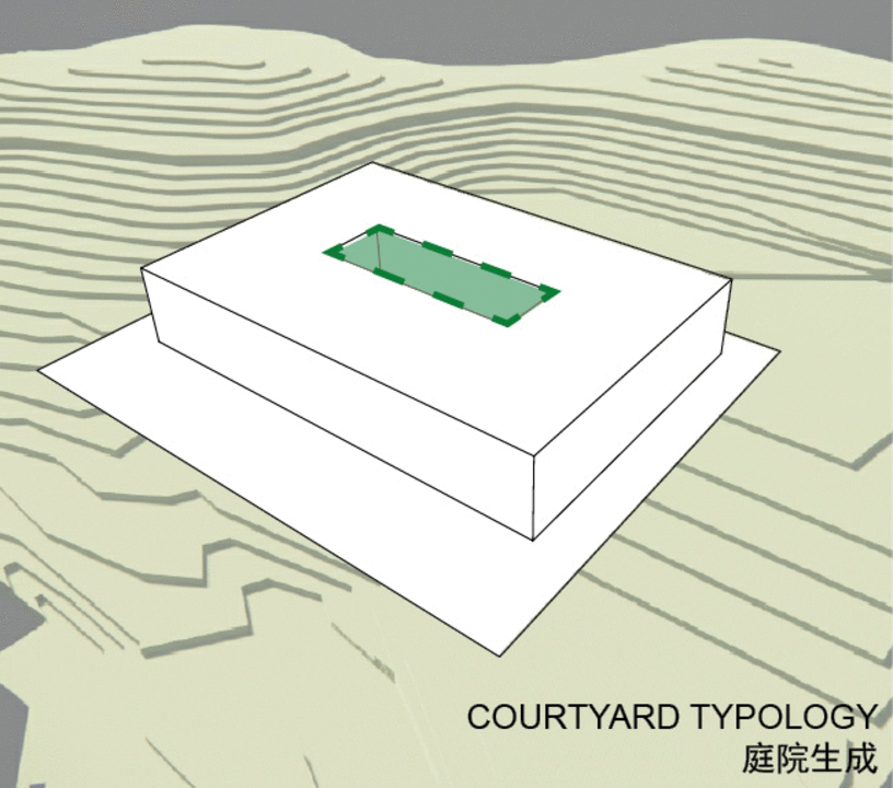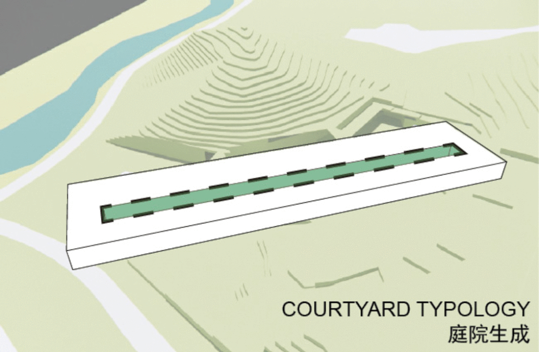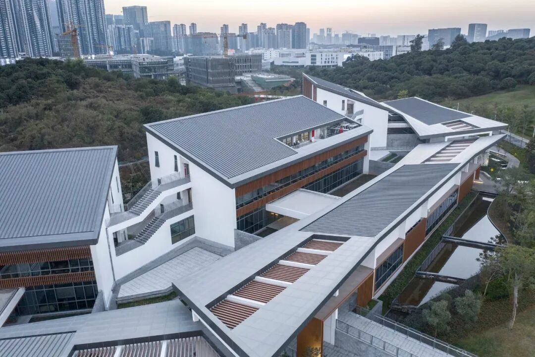 在形态上,建筑的屋檐围合出的庭院提供了宁静的学术环境,发扬岭南建筑中建筑与庭院相互交融的特质。每个学科所在的建筑内部都拥有一个独立的内庭院,学科的办公室和教室向外享有湿地和山体景观,向内拥有宁静的庭院景观。