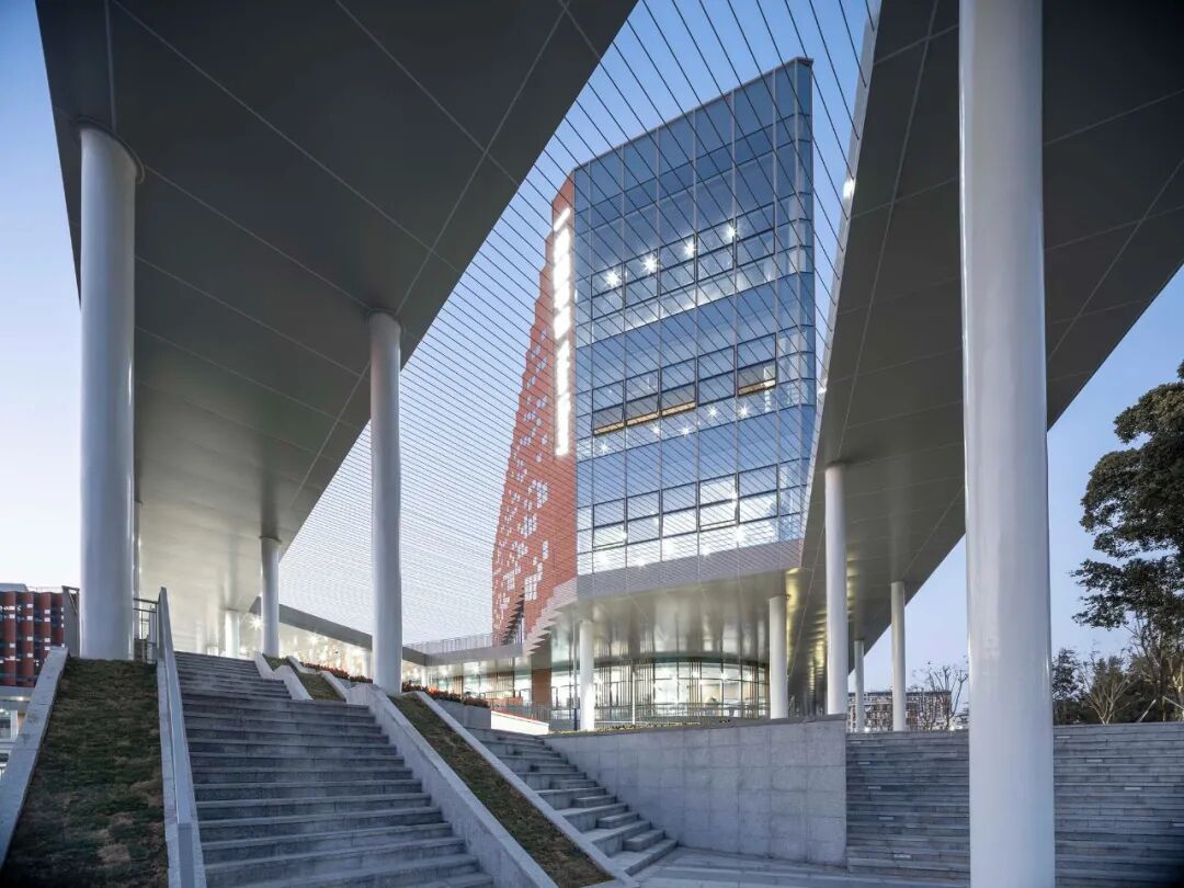 The well-connected annular system effectively unifies the building blocks with different functions. The green walking corridor is interspersed to create a vivid public space. The humanized microclimate is in deep contrast with other single buildings on campus. Teachers and students can easily travel among the buildings, and fully enjoy indoor and outdoor activities without being disturbed by bad weather. The exterior walls seem to be wrapped in large warm colored curtains, reflecting a clean and elegant atmosphere. Stones, light terracotta slabs, and glass are arranged regularly to guide people into the interior.