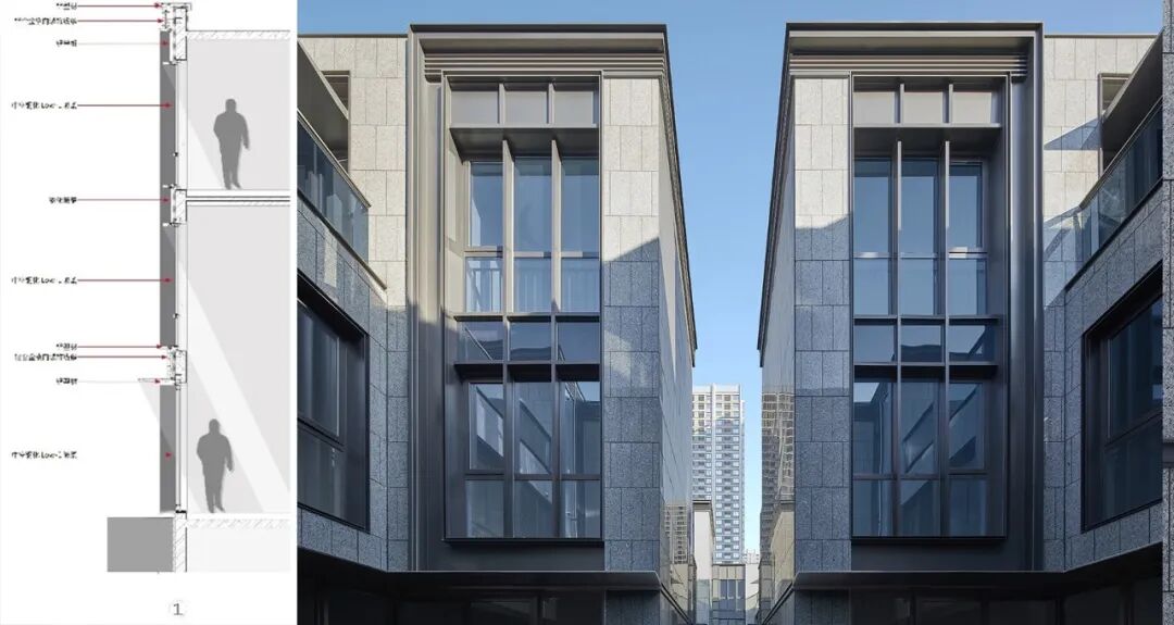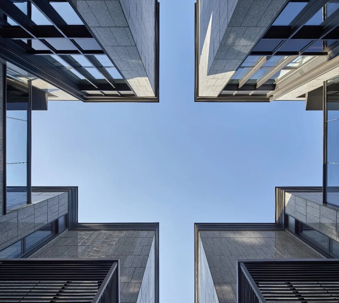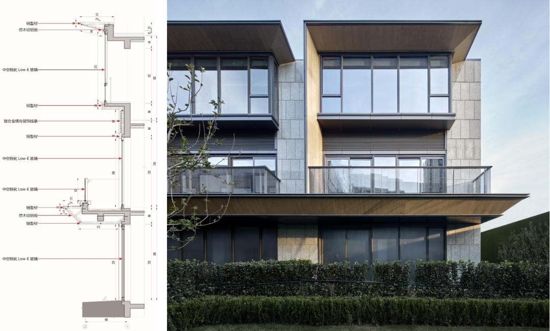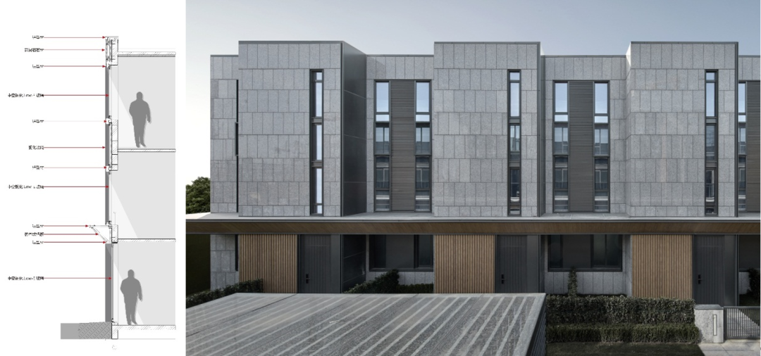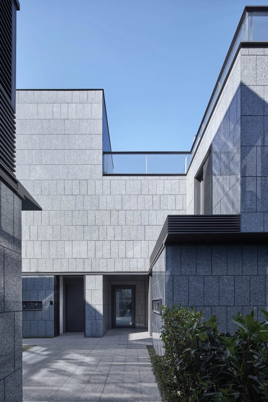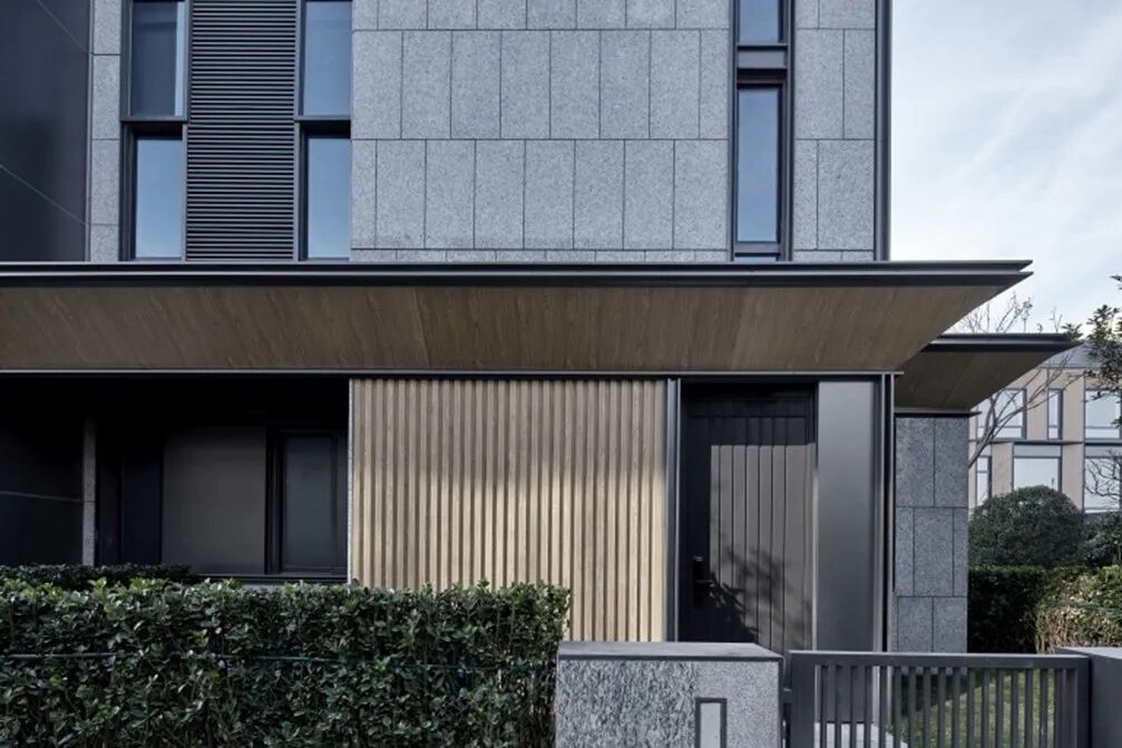 细节上,建筑师将在公建中普遍使用的型材,大量使用在建筑的外立面之中,提高了建筑的精度。珍珠蓝石材冷峻的外观带给了建筑高格调的现代气质,而暖色塑木的点缀则调和了冷色石材的硬朗空间,给人以家的温度和亲切感。在微观工艺设计上,无论是框形的石材基座、封闭的窗户、开敞的阳台还是挺括的竖向线条,均使用深色型材收边,从细节处体现建筑之美,工艺之精。