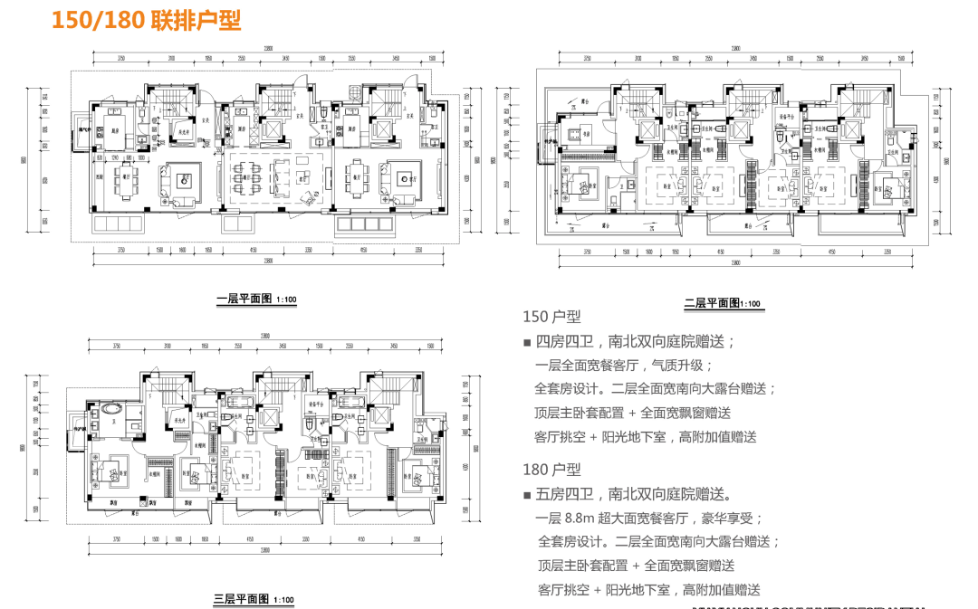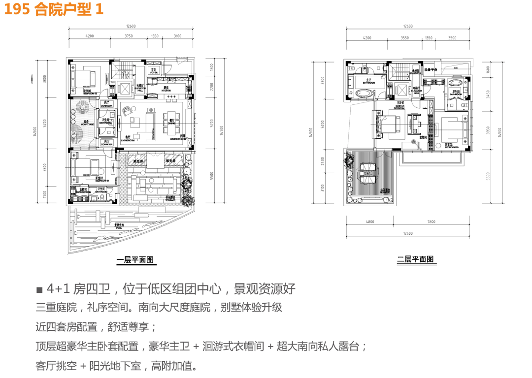 低区产品中,面积段与圈层布局匹配,外围乐高小合院采用140平方米的2面宽L型布局,中间段联排采用185平方米的2.5面宽产品,核心位置大合院采用3面宽的多院落格局。低区产品除常规的KDL布局、屋顶露台外,通过地下两层赠送,多院落布局,全套房配置等手段,极大提高了产品力。