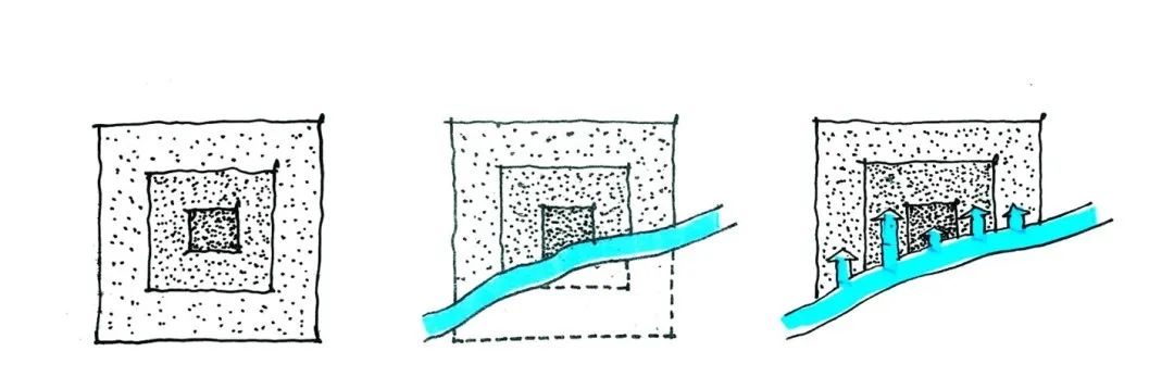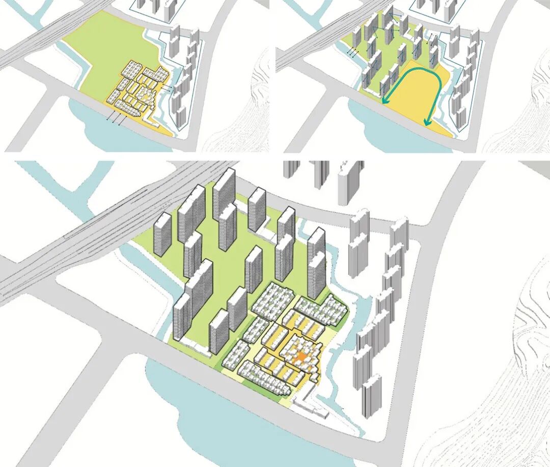 在此格局之下,水景得以最大限度的渗透,同时形成丰富的沿岸建筑轮廓线。