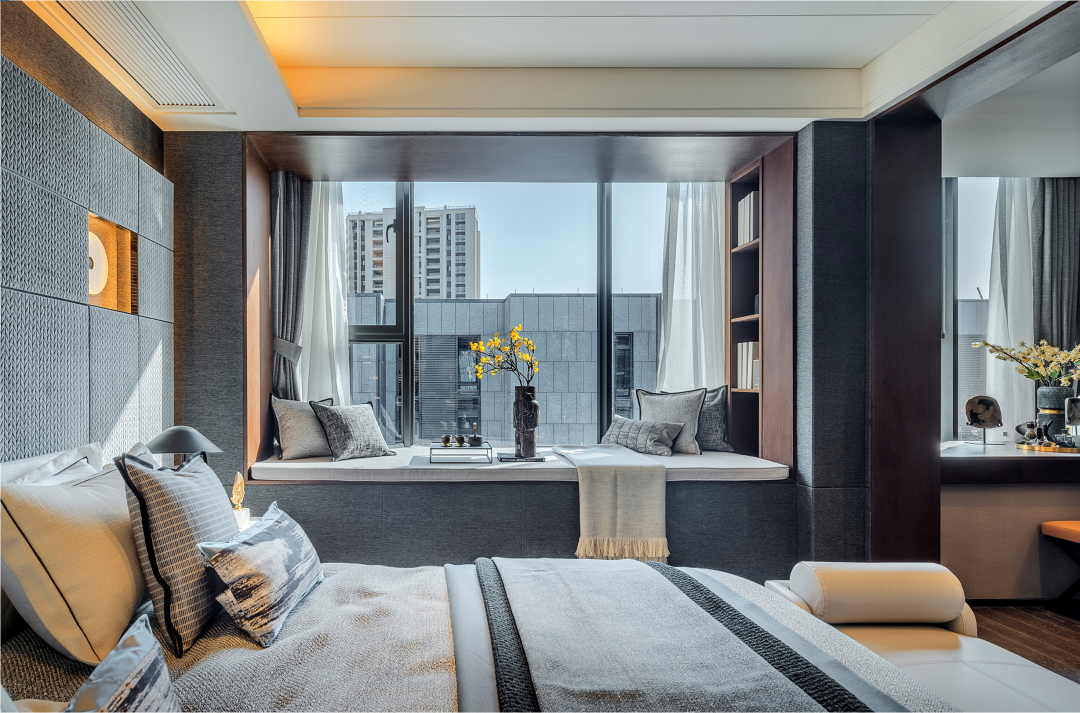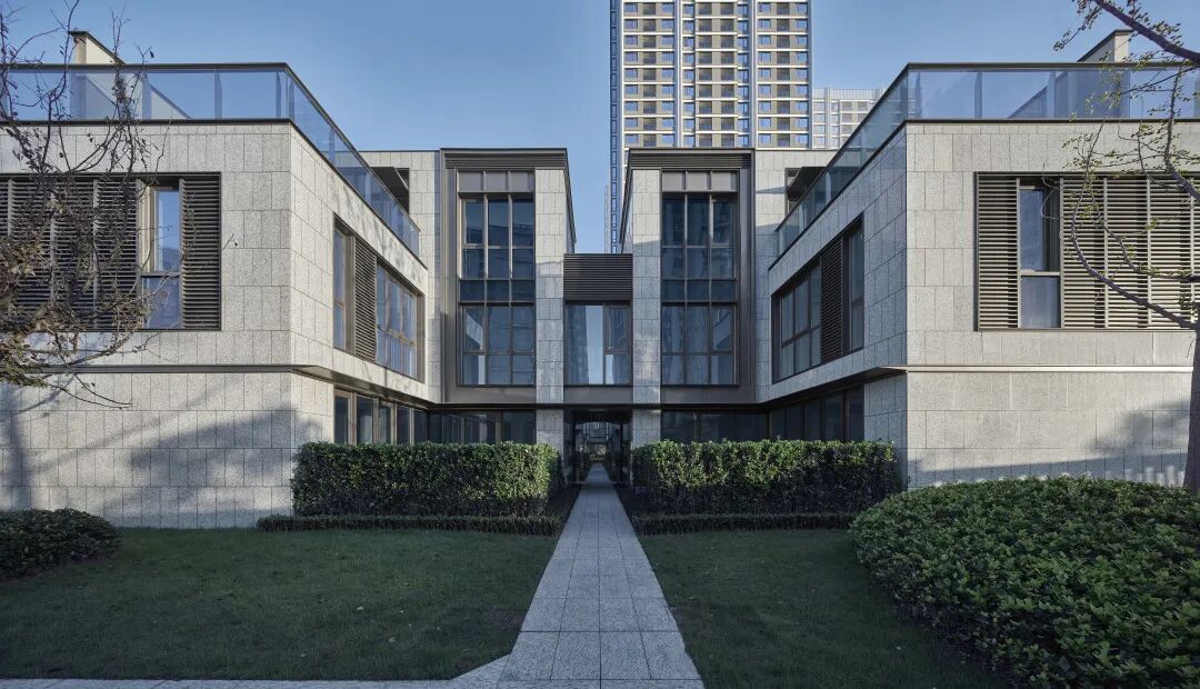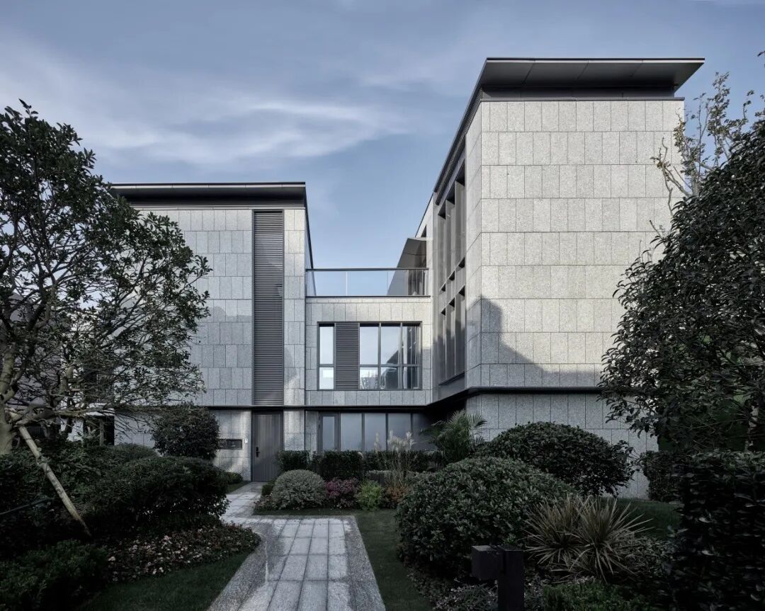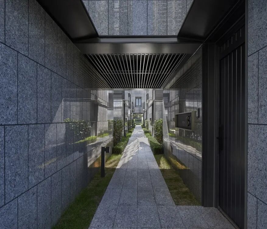 低区的整体建筑风格根植于江南院落特色的取景文化——“通透,整体和框景”,并突破传统中式建筑的立面语言,用现代的手法和材料对低密建筑的立面有了新的演绎,建筑师乐意发挥的开款设计在项目中体现的淋漓尽致。“框景”是传统江南园林造景手法之一,是利用门窗洞将园子内景色纳入其中,使其如同镶嵌在画框中的风景画。而乐虹湾现代低密产品的“框景”,取其传统意义精髓,加入现代设计手法,将建筑用框勾勒,以框筑景,使人的视线更集中在需要欣赏的建筑本身上,让建筑更为突出。这种立意于新老建筑在材质和设计手法上的碰撞,是对传统文化的一次别开生面的演绎,最终呈现的建筑既具现代感,又不失在地性。