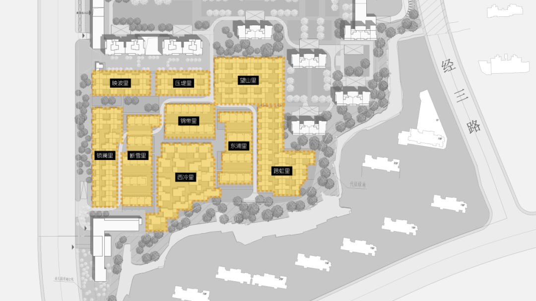 “街”还将整个低区划分成九个组团,其中,小合院五个组团,分别为锁澜里、映波里、压堤里、望山里、跨虹里;联排三个组团,分别为断雪里、锦带里、东浦里;大合院一个组团,西冷里。