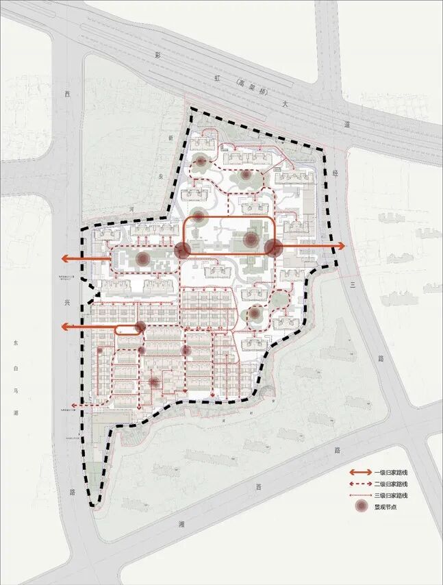 乐虹湾社区底盘高区与低区采用不同的策略,高区强调都市感,大开大合,入口设于靠近彩虹大道与经三路交叉口,靠近轨交站点,结合入口布置商业配套,通过内凹的入口广场-中心花园-组团庭院三级空间组织归家动线。