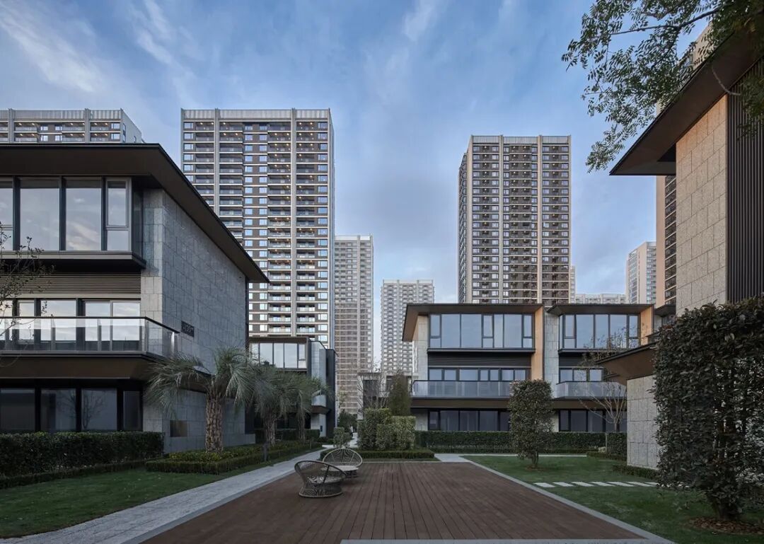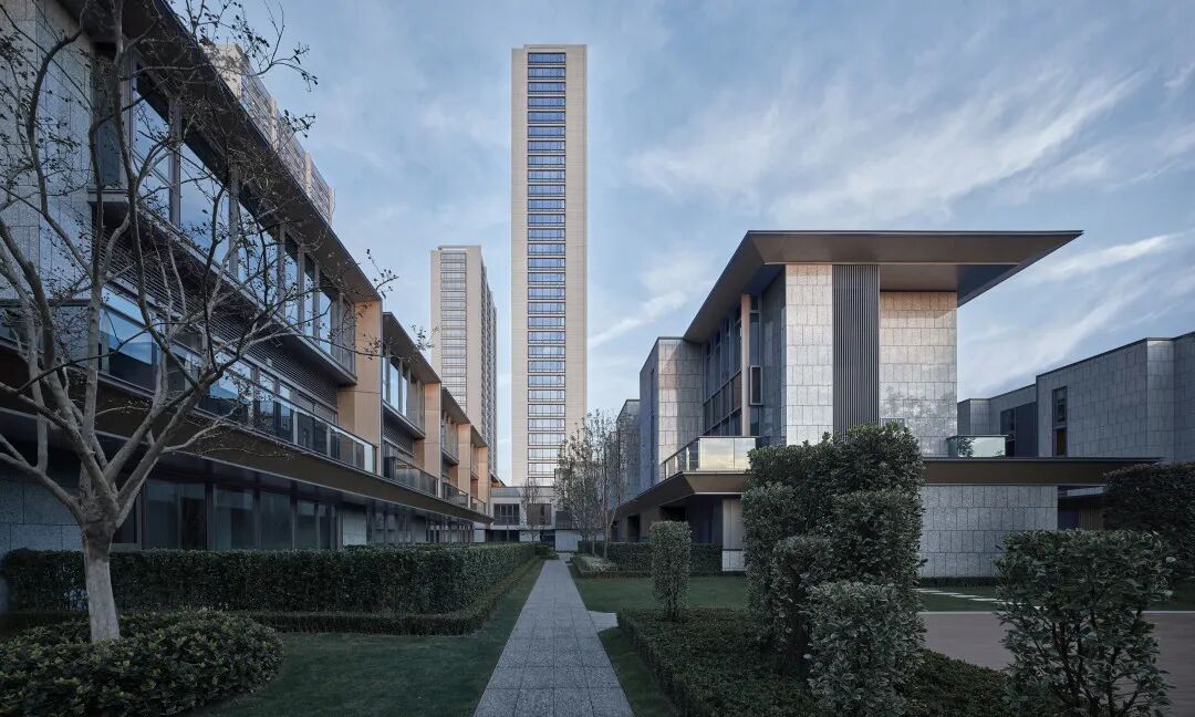 高层方面,建筑师对标了悉尼的Lumiere公寓,两者在立面上均拥有简洁利落的竖向线条和通透轻盈的玻璃外观,提升室内使用者的体验感,对景观和采光极致利用。栋与栋之间的错位布置,在侧向打开白马湖景观,同时在大盘布局上又守住了中轴对称,做到户户有景,底层空间的布局也都为住户提供了丰富的休闲娱乐交流的场所。