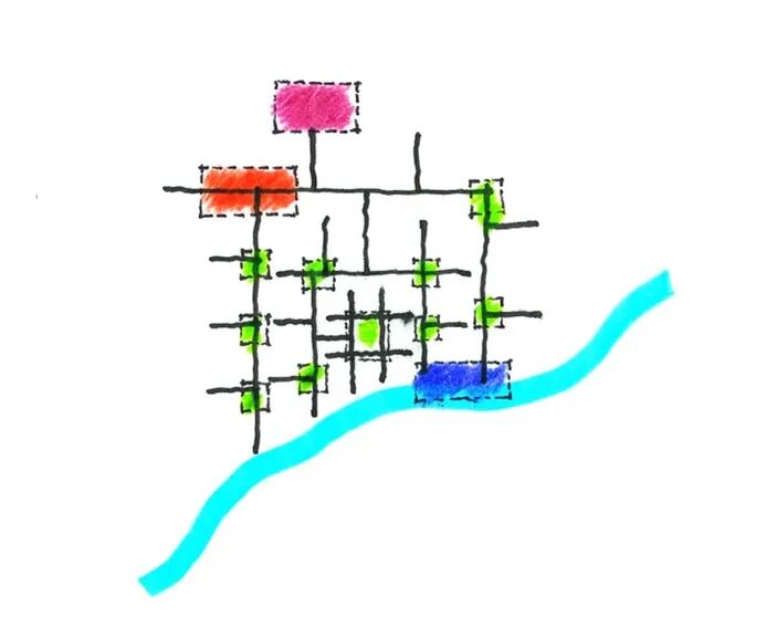 以传统江南城市空间为模本,规划将低区产品根据面积段,形成外围小合院、中间联排、里层大合院的类似传统“城”空间的圈层布局。南侧的水系将这一完整的“城”剖开,使小合院、联排、大合院、联排、小合院从西至东形成的完整断面展现在水系北岸。正如《周礼•考工记•匠人》中记载:“匠人营国,方九里,旁三门。国中九经九纬,经涂九轨,左祖右社,面朝后市,市朝一夫。”