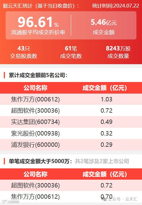 2024年7月22日,大宗交易成交金额5.46亿元,交易股票数43只,成交笔数61笔,流通股平均成交折价率96.61%,成交数量0.82亿股。