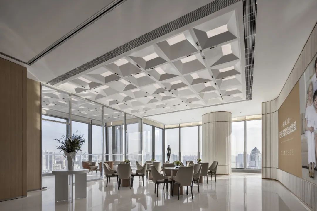 WIT方夏设计在国际招投标中胜出研发位于高耸入云的武汉恒隆广场的首家泰康口腔。这也许是中国最高的口腔诊所,第29层的标高已过百米,印证了泰康在这一领域的追求。此时大团云朵飘来,泰康口腔恍然坐落“天庭”。