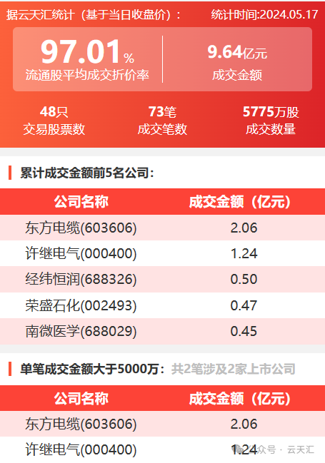 2024年5月17日,大宗交易成交金额9.64亿元,交易股票数48只,成交笔数73笔,流通股平均成交折价率97.01%,成交数量0.58亿股。