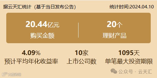 2024年04月10日,上市公司购买理财金额20.44亿元,共10家上市公司,理财产品20个,单笔最大投资期限1095天。