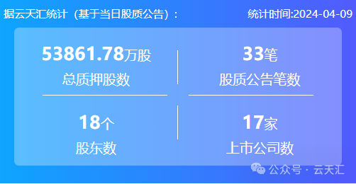 2024年4月9日,股票质押总质押股数5.39亿股,上市公司数17家,股质公告笔数33笔,股东数18个。