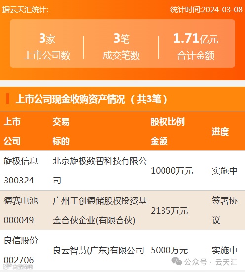 2024年3月8日,资产交易成交金额1.71亿元,上市公司3家,成交3笔,上市公司现金收购资产3笔。
