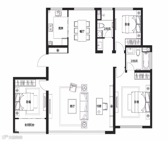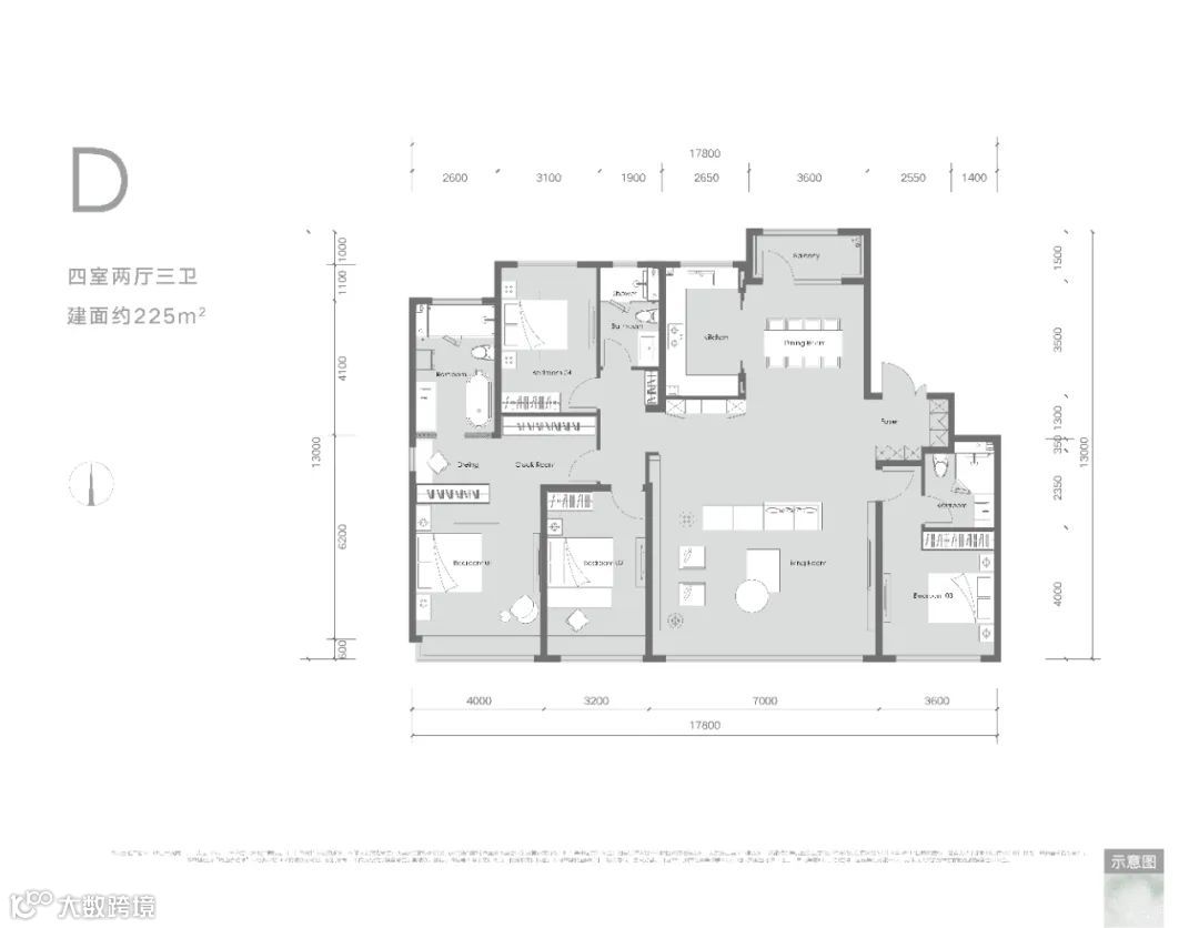 ●精研公共空间对于家庭成员重要性,168平米的四居室,做到了四南向、三南卧的极致户型,能够更好地平衡家人空间所需;