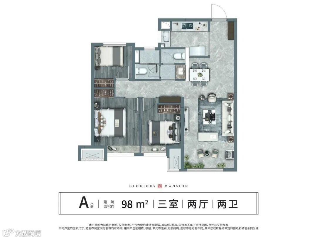建面约98㎡的全能三房,以不到百平的面积实现奢阔三房设计,1.5卫的全新理念,满足功能需求的同时,释放更多生活空间!