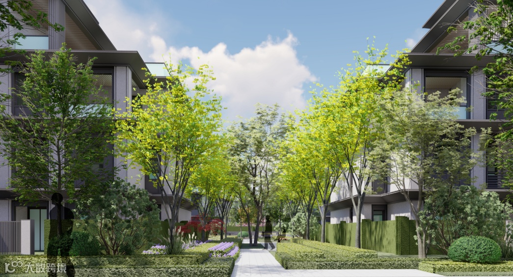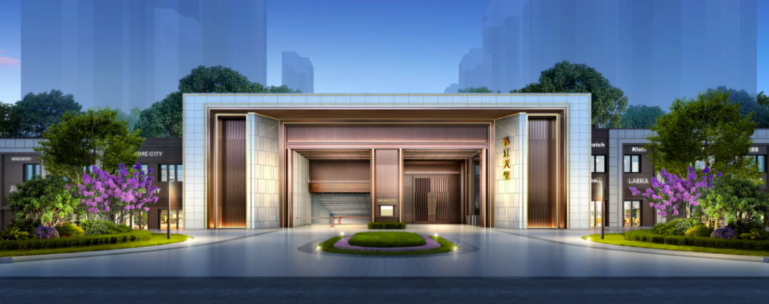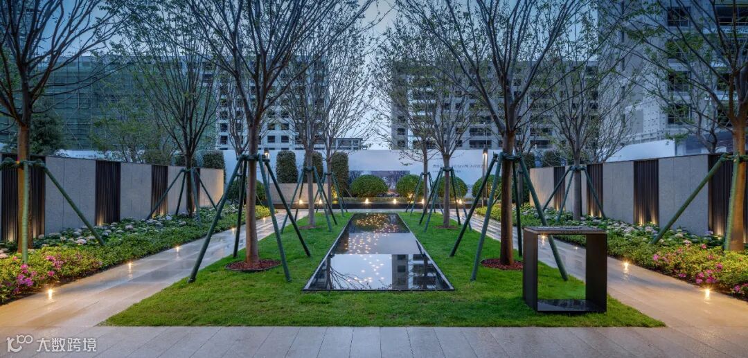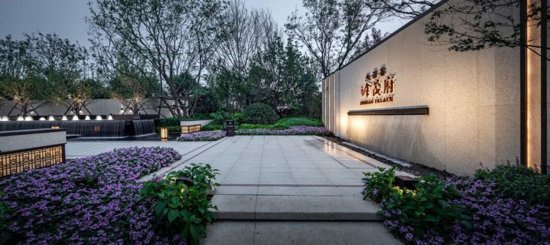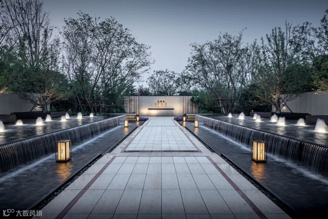 中轴对称布局,林荫树阵氛围,景墙与水系围合式,为业主营造出则繁华,入则宁静的归家仪式感;