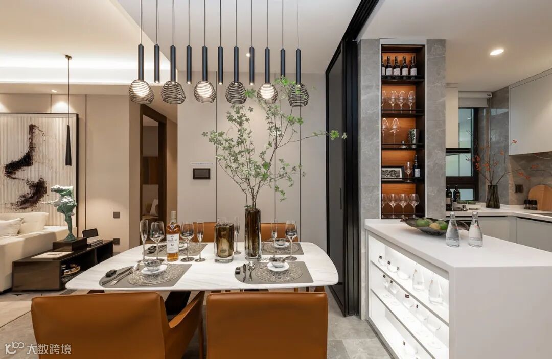 ●LDK超维复合厅将单一功能空间进行融合,客餐厅的组合扩大了社交与活动空间,增加了居住的舒适度与互动性。提供家人之间的互动交流场域,让家庭场景温暖交互;