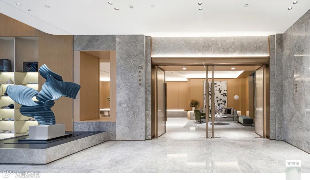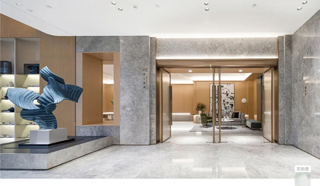 艺术大堂采用现代设计风格,在立面考量上,甄选历经百年恒新的美国白金石材,细腻纹理散发出自然的润泽,在阳光下素雅且高贵,呈现庄重、典雅的建筑气质。同时辅以玻璃肋幕墙、铂金灰金属铝板等,整个立面在空间与光影无界的交融中,展现出惊艳的美学生命力。
