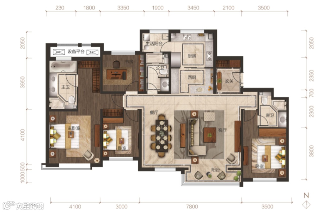 210平户型,整体开间达到18.4米,进深扣除阳台只有10.5米。横厅开间达到7.8米,双套房设计。