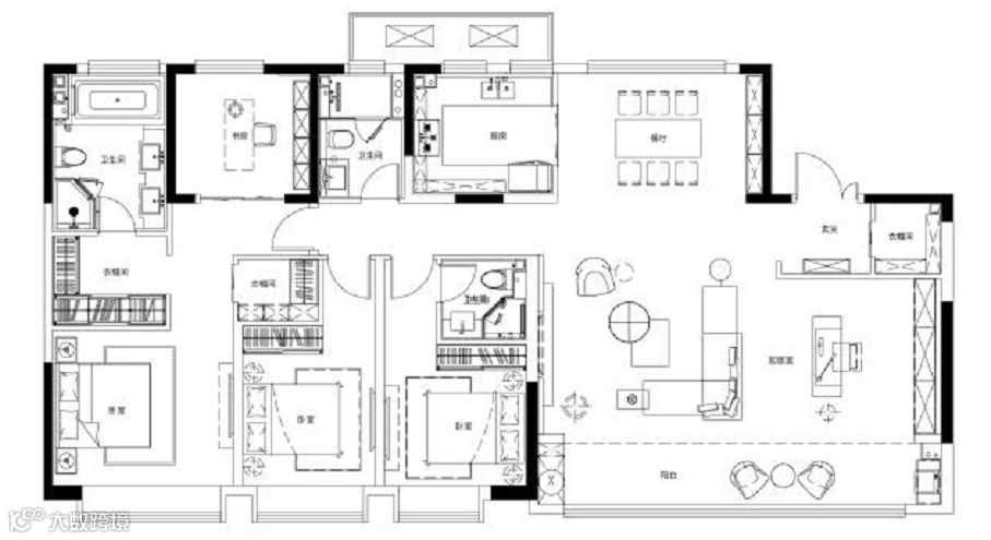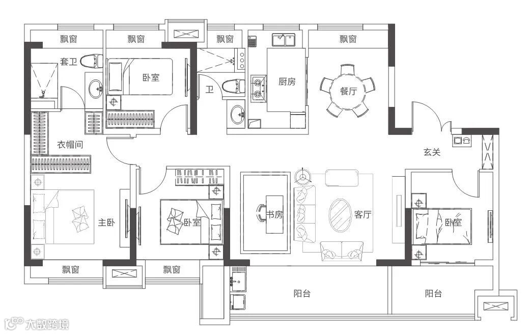旭辉敔山公元项目165平四房户型,整体非常方正,有三个房间朝南,客厅面宽约6.6米,能放下环形沙发,阳台约9.2米,休闲空间足够大。