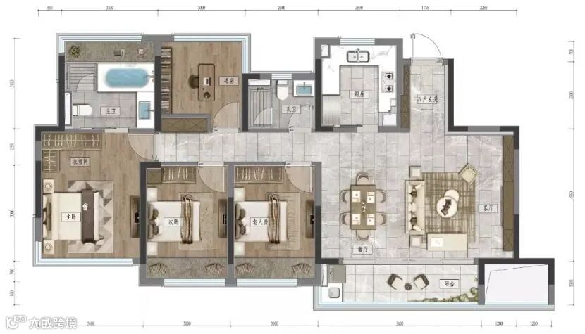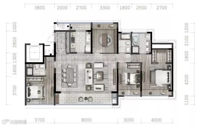 同样杭州棠玥湾洋房神164㎡户型。所有卧室开间都很舒适,主卧套开间达3.9米,次卧套3.3米。南向总面宽达15.9米,阳台足足有8.7米长。