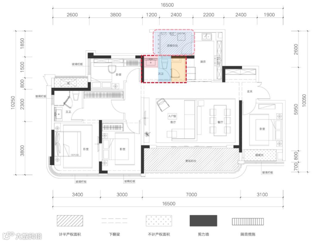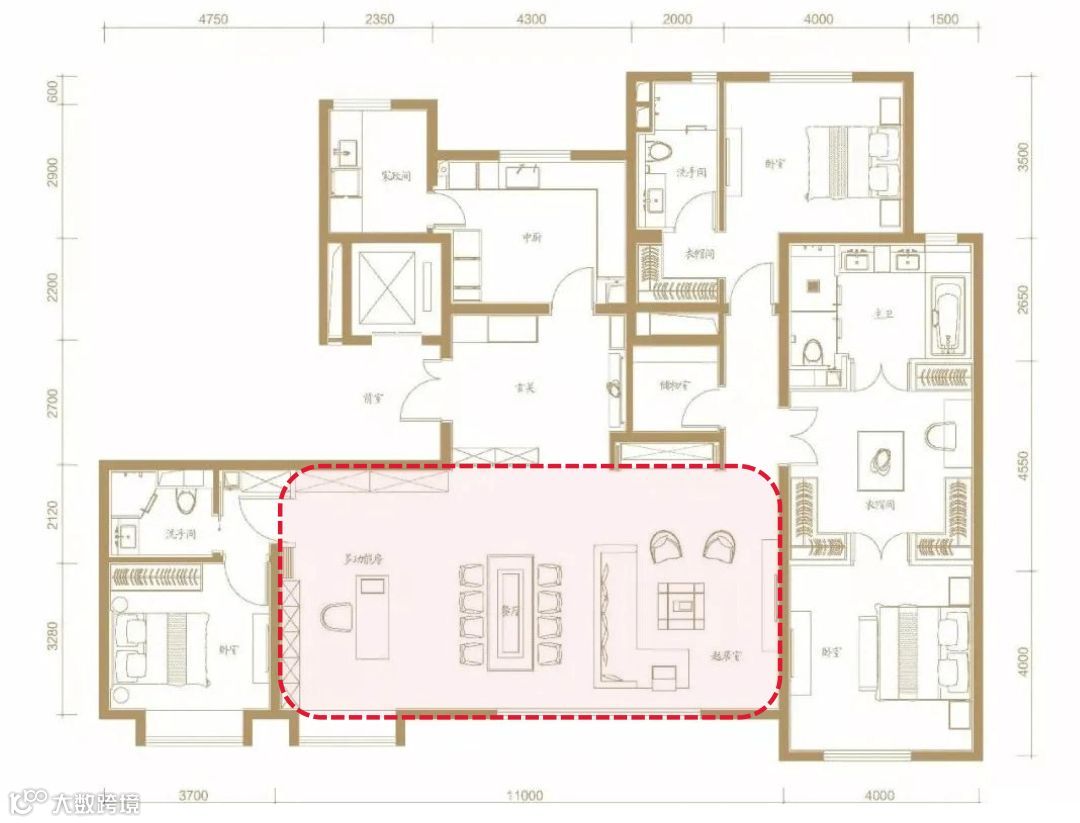 它还是一个超级宽薄户型,总体南向总面宽达17米;大横厅宽6.5米,主卧3.9米,次卧3.3米,餐厅位置和尺度非常舒服,宽4.1米。