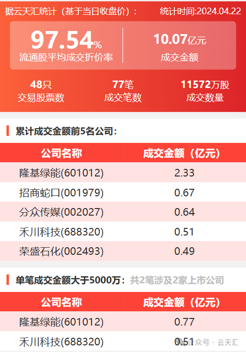 2024年4月22日,大宗交易成交金额10.07亿元,交易股票数48只,成交笔数77笔,流通股平均成交折价率97.54%,成交数量1.16万股。