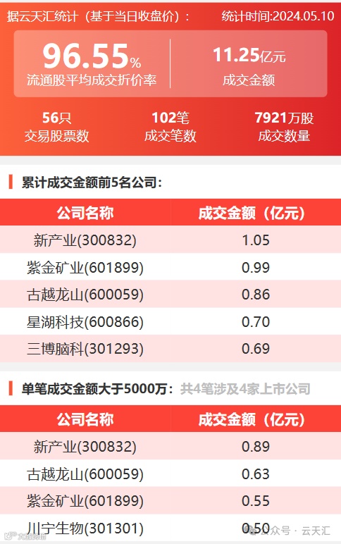 2024年5月10日,大宗交易成交金额11.25亿元,交易股票数56只,成交笔数102笔,流通股平均成交折价率96.55%,成交数量0.79亿股。