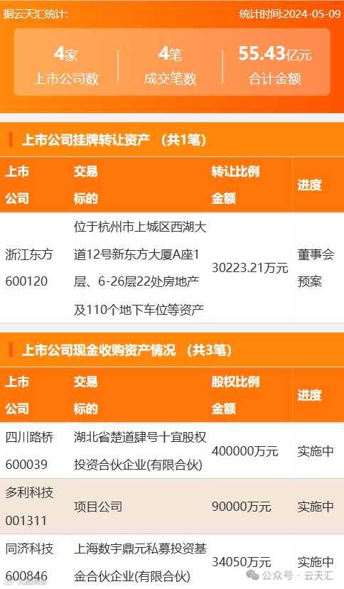 2024年5月9日,资产交易成交金额55.43亿元,上市公司4家,成交4笔,上市公司挂牌转让资产1笔,现金收购资产3笔。