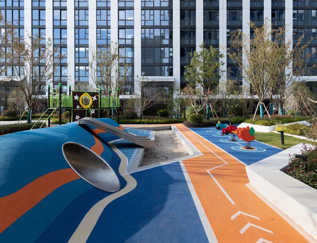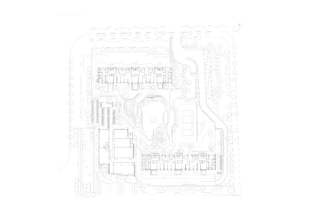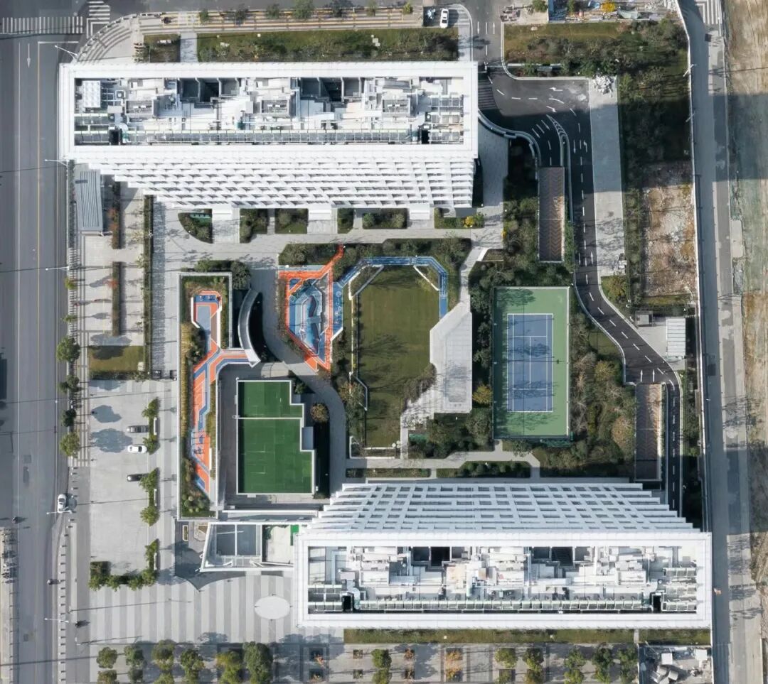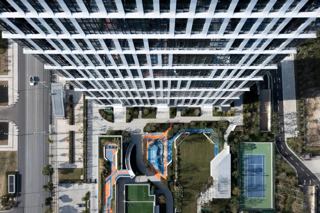 由于项目基地空间有限,建筑师将高层首层架空,裙房做上人绿化屋面,创造出了网球场,漫步跑道,儿童活动天地,邻里会客厅,公共礼仪草坪,架空非机动车库等丰富的社区活动空间。