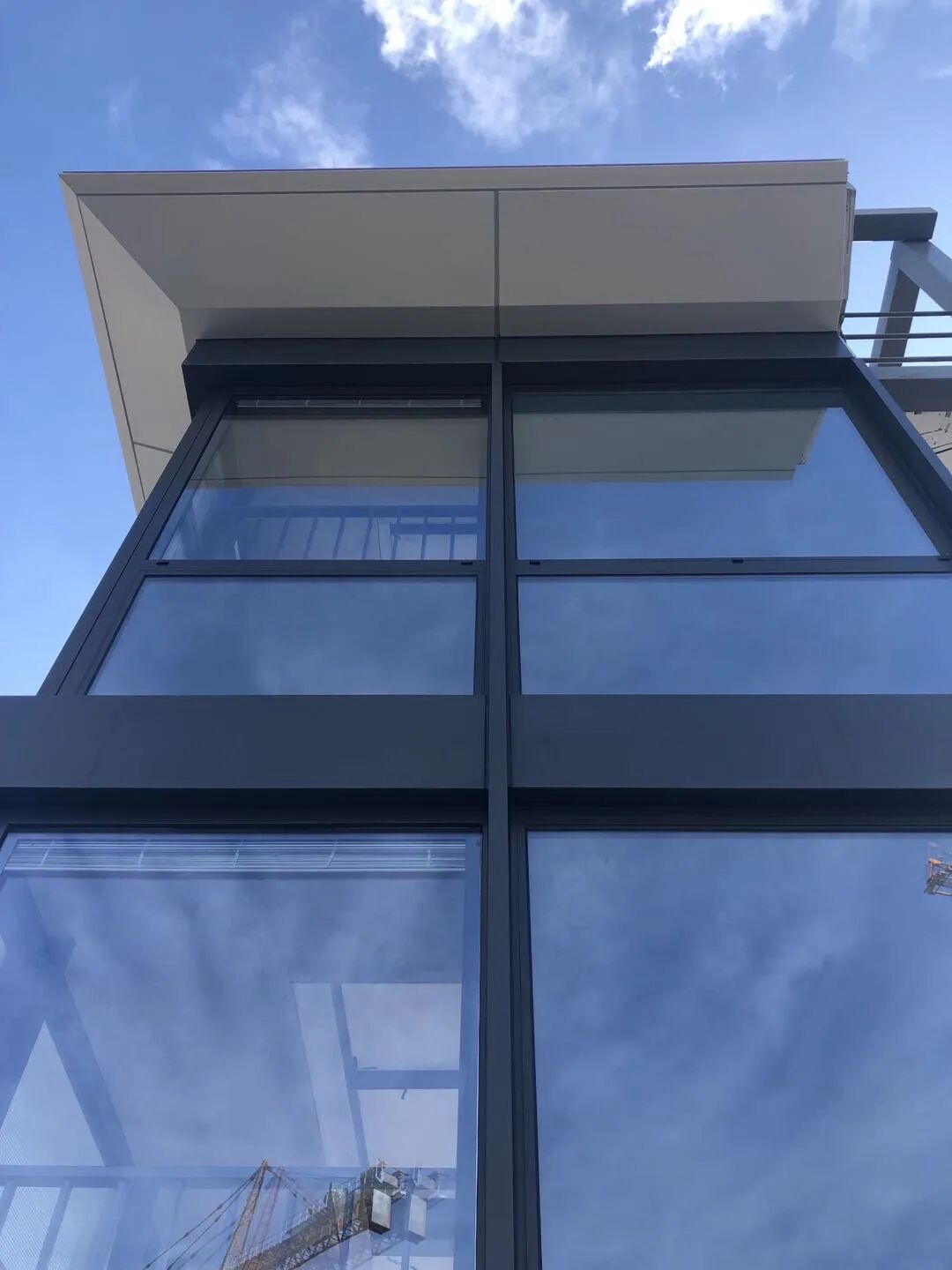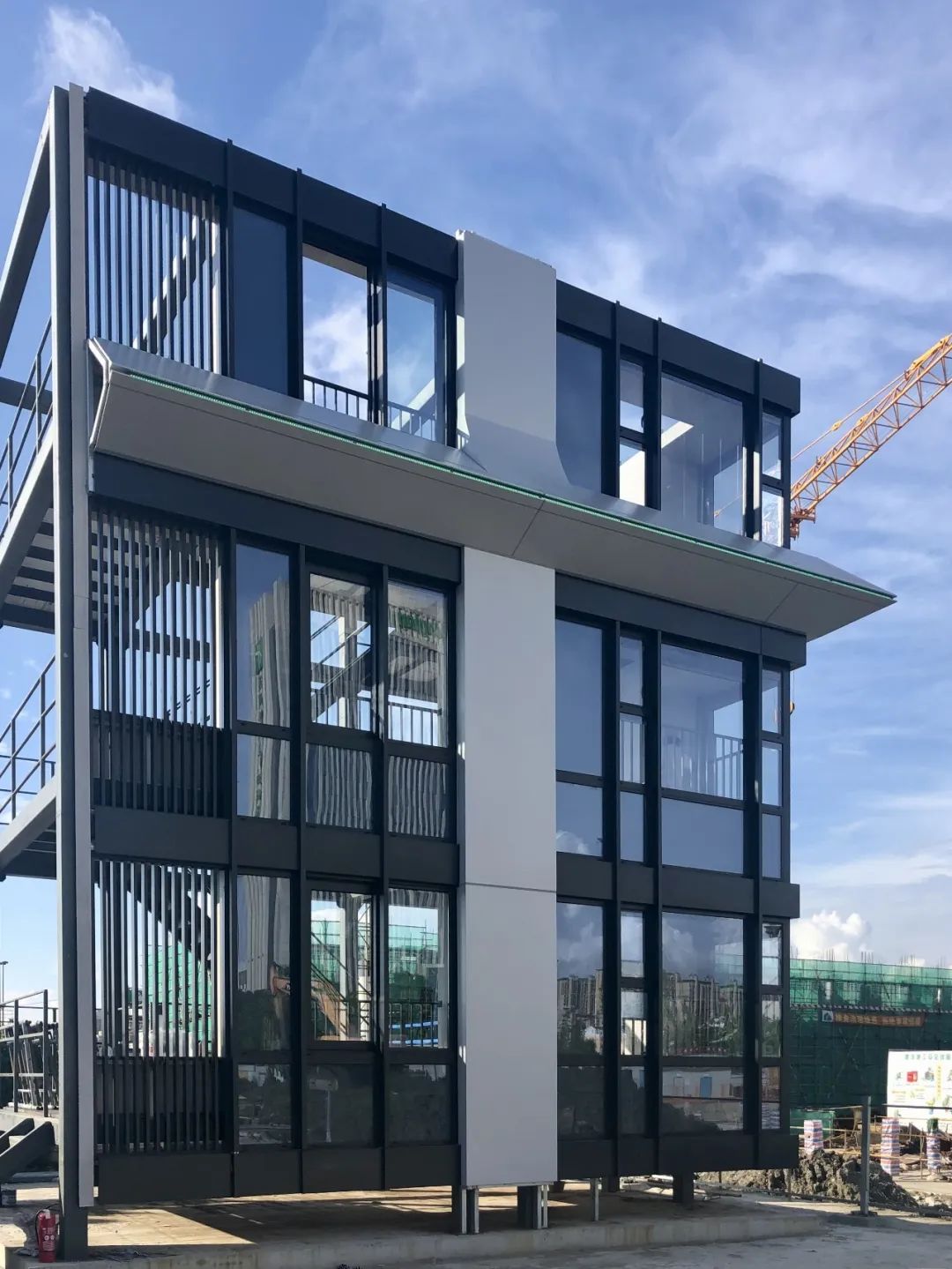 建筑材料选择了色彩明快的香槟银色铝板和蓝灰色玻璃做为主面用料,使得建筑整体观感现代简洁。