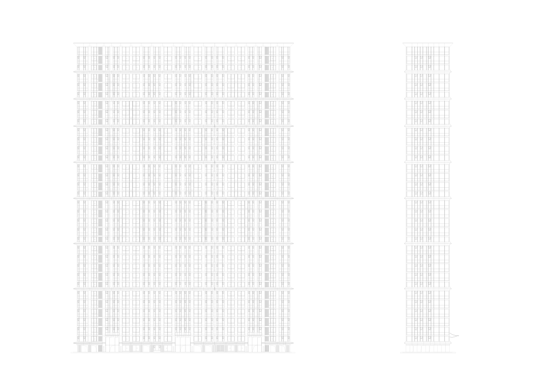 两栋板楼尽量错开,避免视线干扰,争取最大的采光面。配套商业沿广场边界布置,形成完整的商业界面,两栋楼的腹地形成最大化的绿地空间。苏州现行的规划条例对建筑的宽度有55米上线规定,此案的两栋建筑至少需要每层8个居住单元才能够满足目标建筑量,居住单元主要已两居室和三居室为主,为了居住的舒适性和室内空间布局的合理性,标准层的面宽接近70米,再多轮不同面宽的平面及建筑空间体量模拟的论证下,政府审批通过了此建筑面宽。在城市空间形态和居住单元的销售性上取得平衡。