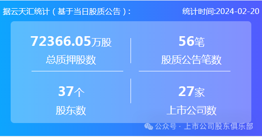 2024年2月20日,股票质押总质押股数7.24亿股,上市公司数27家,股质公告笔数56笔,股东数37个。
