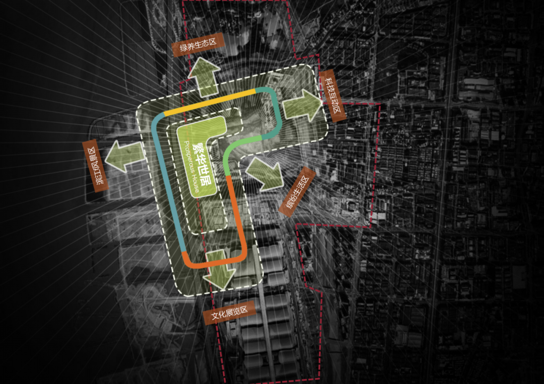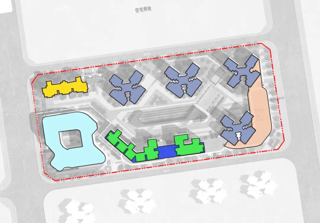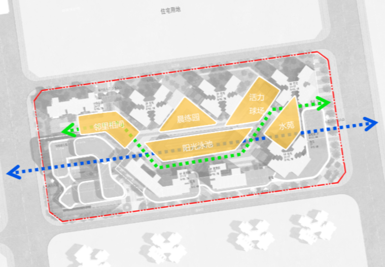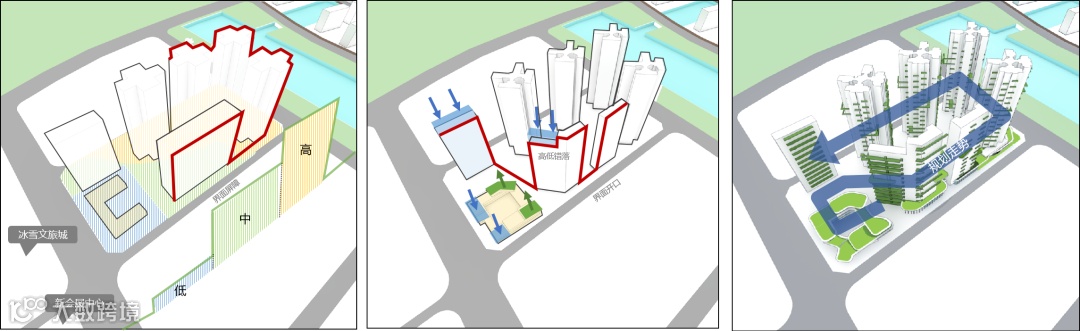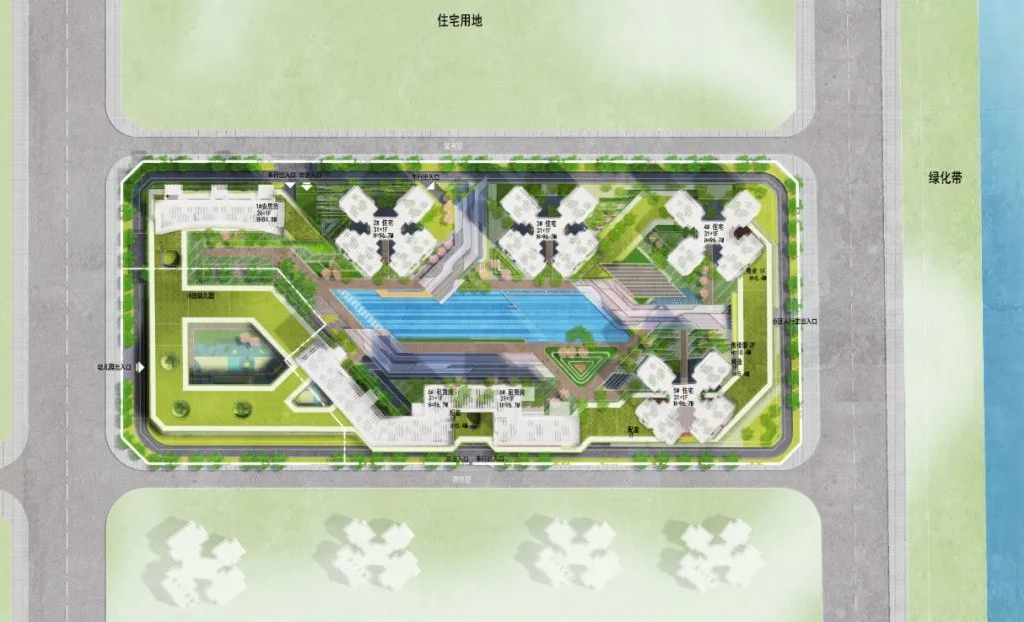 本用地利用自身景观面,打造由东向西形成截水河→用地→商业中心的蓝绿交融场景;串联起用地与片区城市规划的整体性,均衡经济效益与社会效益。