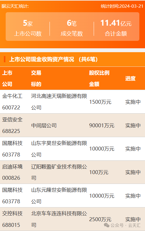 2024年3月21日,资产交易成交金额11.41亿元,上市公司5家,成交6笔,上市公司现金收购资产6笔。
