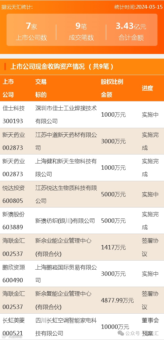 2024年3月15日,资产交易成交金额3.43亿元,上市公司7家,成交9笔,上市公司现金收购资产9笔。