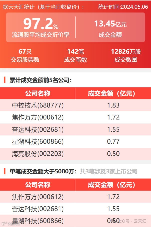 2024年5月6日,大宗交易成交金额13.45亿元,交易股票数67只,成交笔数142笔,流通股平均成交折价率97.2%,成交数量1.28亿股。