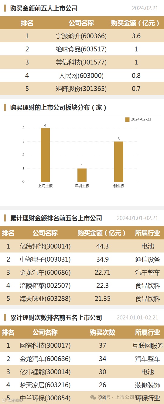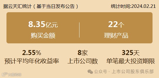 2024年02月21日,上市公司购买理财金额8.35亿元,共8家上市公司,理财产品22个,单笔最大投资期限325天。