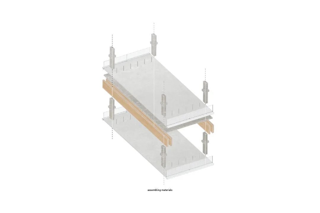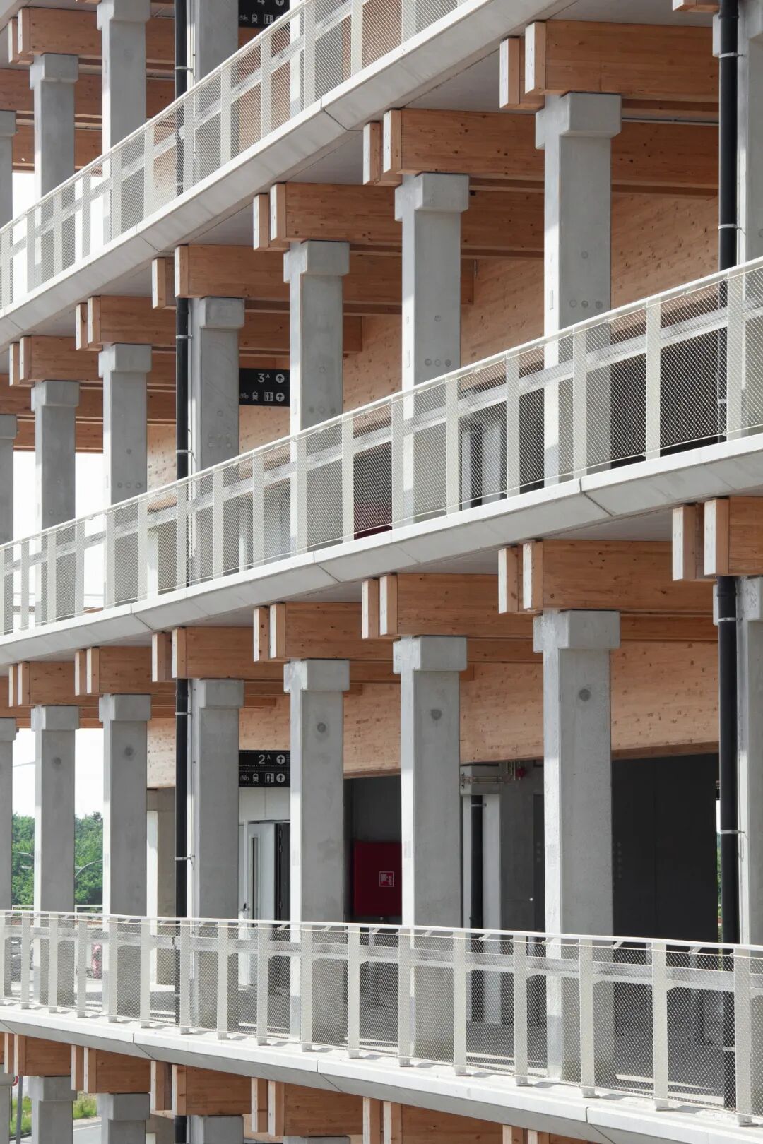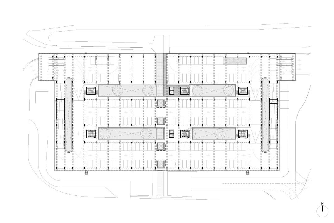 没有外墙。取而代之的是,非常整洁的混合结构——混凝土柱和木梁(为了更可持续的材料使用)——被强调了。位于中心的天井将日光带入建筑物,并用于引导各种交通流。