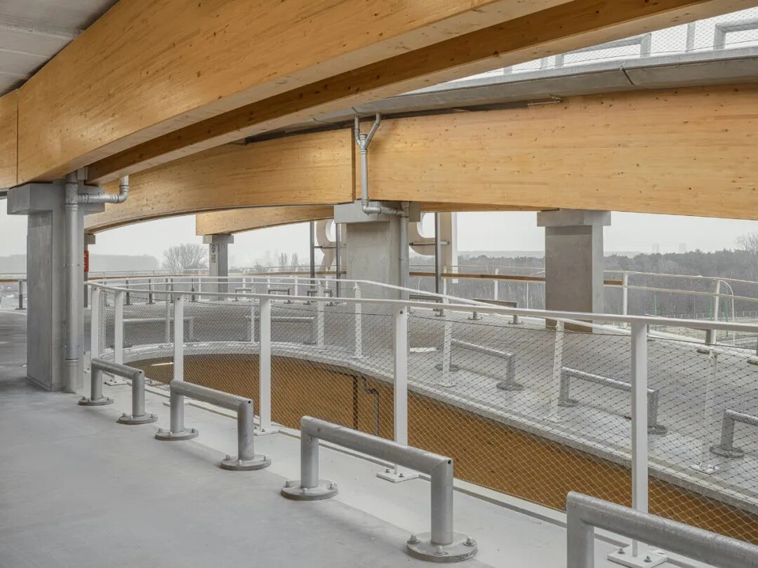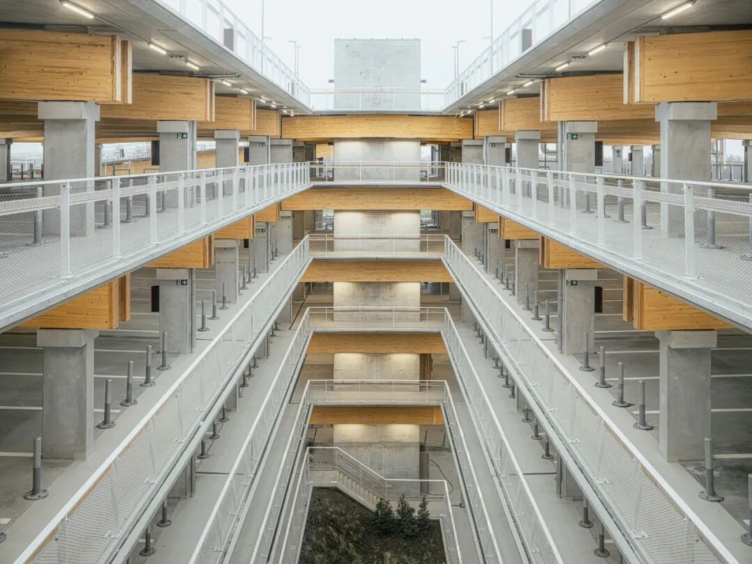 There are no facades. Instead, the very neat, hybrid structure – with concrete columns and timber beams (for a more sustainable material use) – is emphasized. The centrally located patios bring daylight into the structures and serve to orientate the various traffic streams.