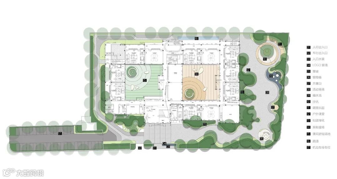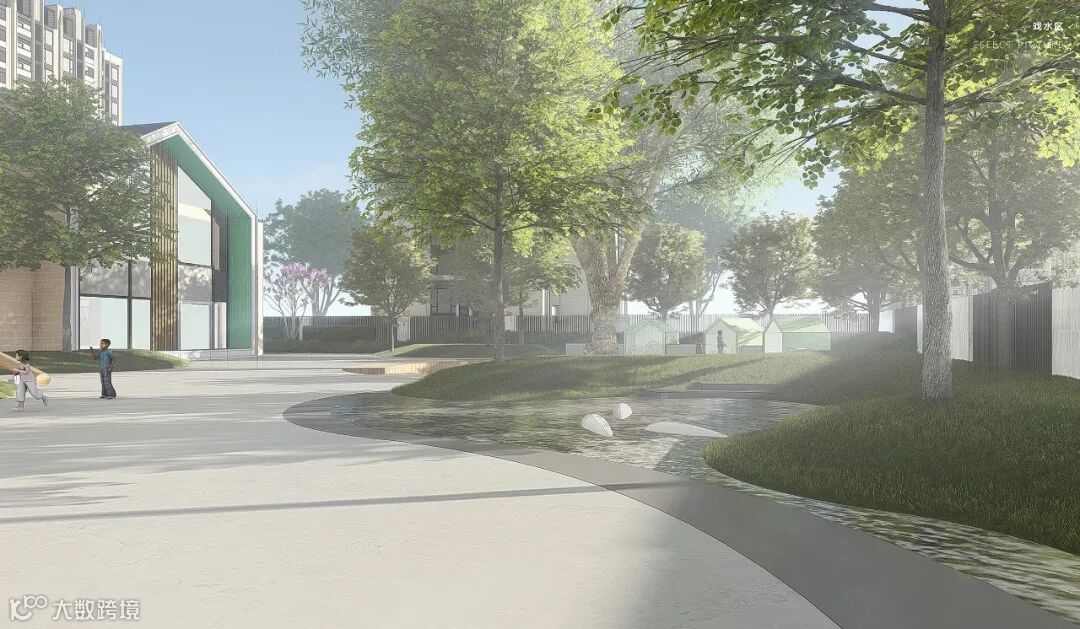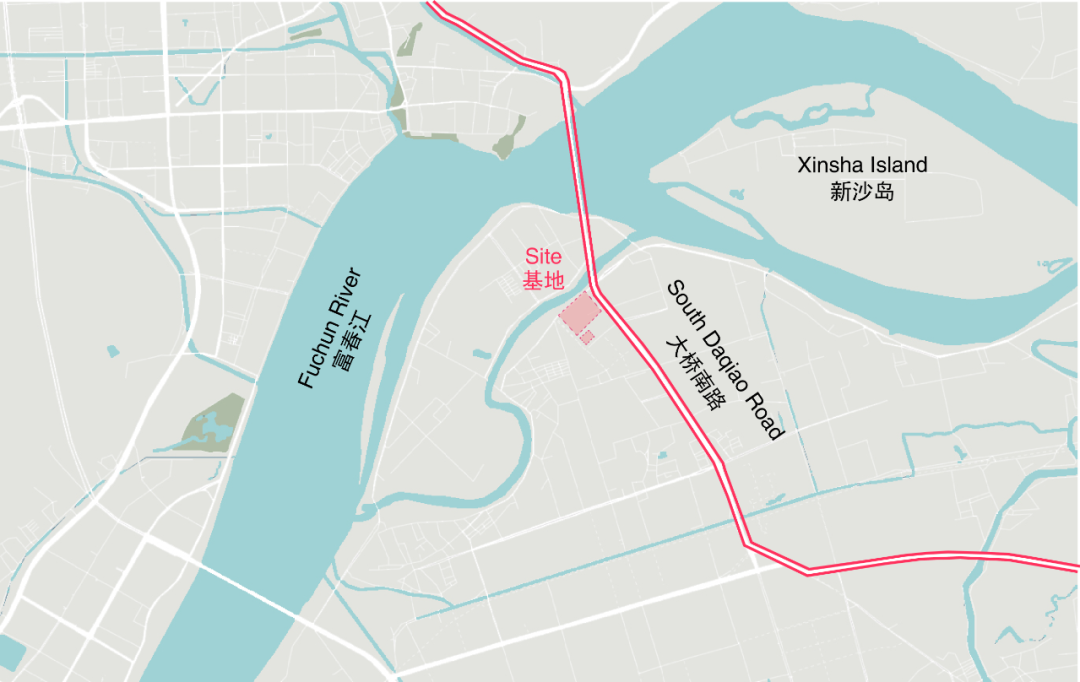 上海外国语大学附属杭州学校是一所包括从幼儿园到高中的15年一贯制学校,位于杭州市富阳区富春江南岸。其中幼儿园总建筑面积9796平方米,共18班,可容纳400名儿童。在校园整体规划设计的初期,幼儿园被布置在校园南侧,位置相对独立利于管理。