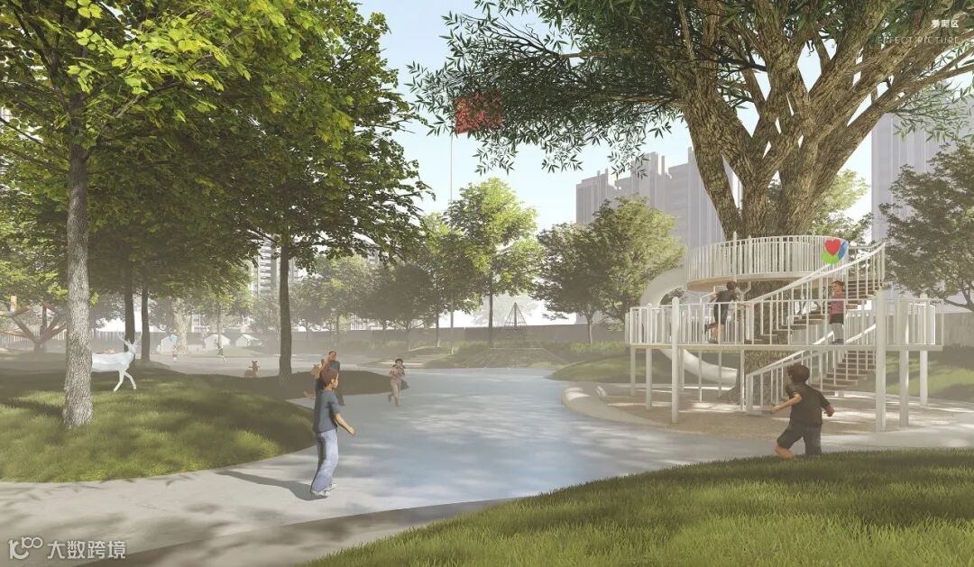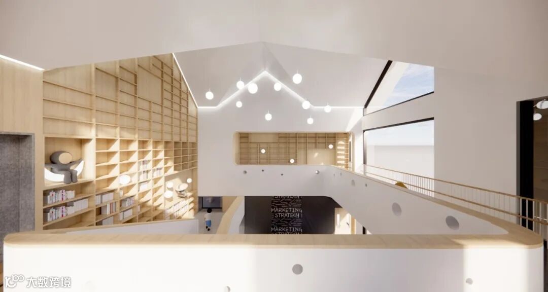 木饰面的连贯栏杆扶手,形成了有机的路径体系,鼓励着孩子们在空间里探索穿梭。实体栏杆上一个个大不一,高低错落的小洞,使得在保证孩子们安全的前提下,与不同高差的对视变成可能。
