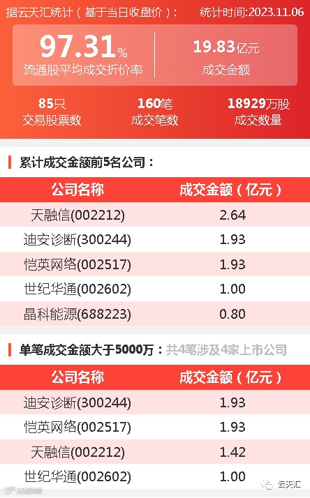 2023年11月6日,大宗交易成交金额19.83亿元,交易股票数85只,成交笔数160笔,流通股平均成交折价率97.31%,成交数量18929万股。