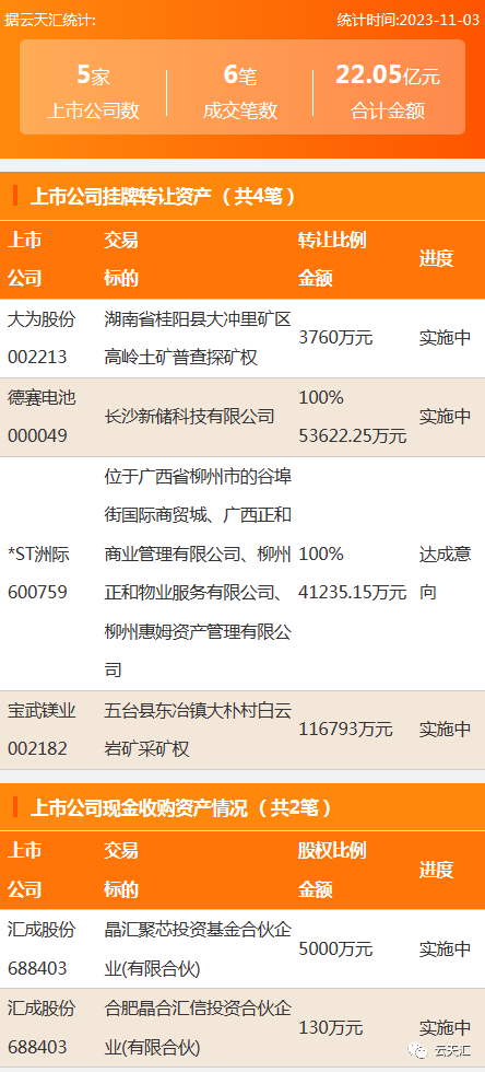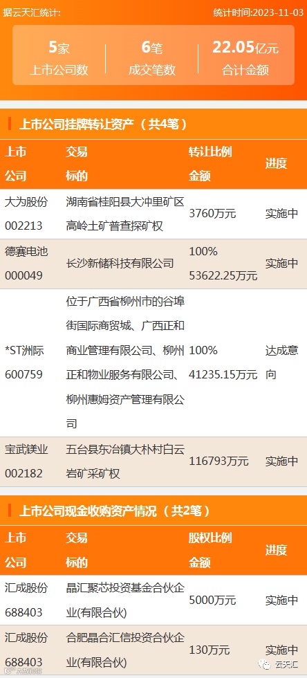 2023年11月3日,资产交易成交金额22.05亿元,上市公司5家,成交6笔,上市公司挂牌转让资产4笔,现金收购资产2笔。