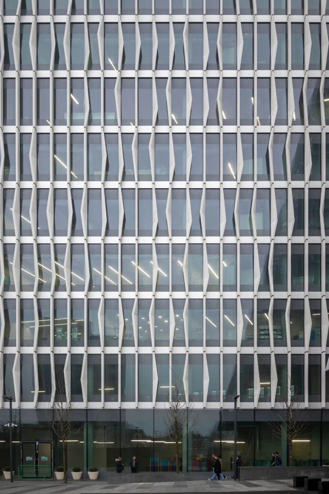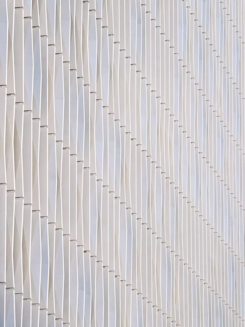 These facades are animated by distinctive fields of 1,300 fins, each four meters tall, cast, and installed in seven different permutations. Their seemingly randomized arrangement provides shading and privacy and yields a rhythmic pattern that evokes the biomedical research in the building: the coming together of the artificial and the organic, of engineering and medicine.