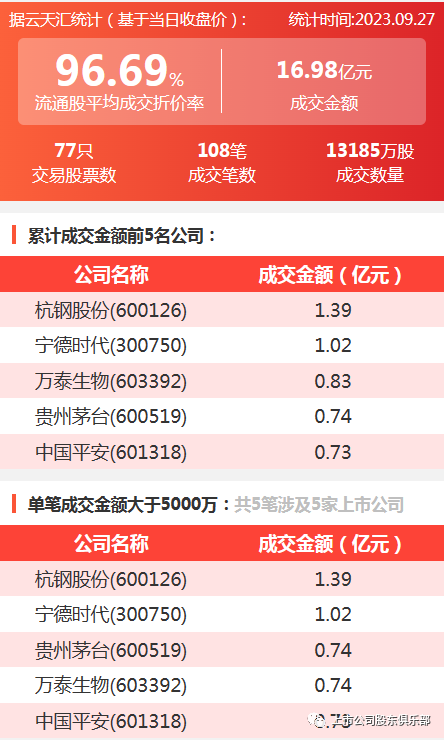 2023年9月27日,大宗交易成交金额16.98亿元,交易股票数77只,成交笔数108笔,流通股平均成交折价率96.69%,成交数量13185万股。