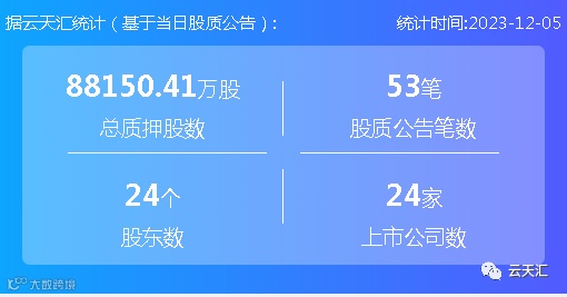 2023年12月5日,股票质押总质押股数8.81亿股,上市公司数24家,股质公告笔数53笔,股东数24个。