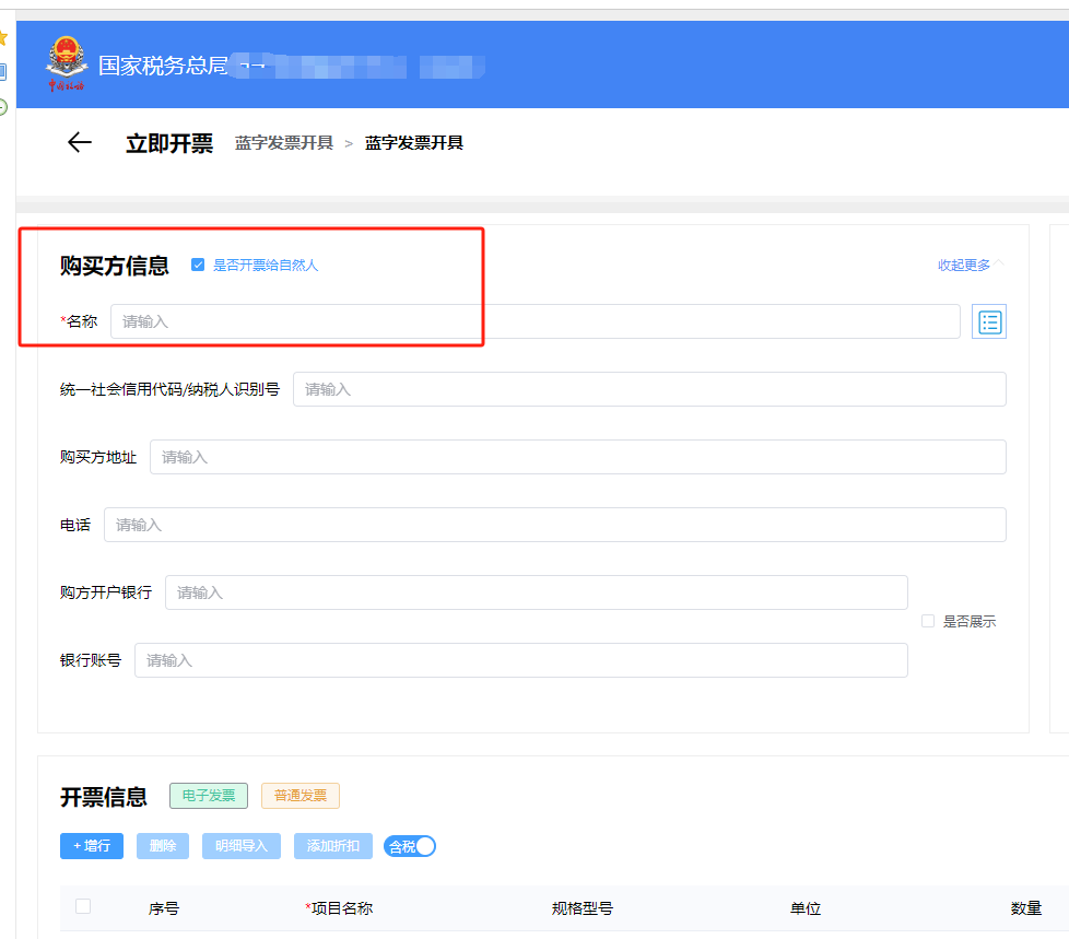 如果在电子发票服务平台开票给自然人,在【蓝字发票开具】开票信息填写界面”购买方信息”右侧勾选”是否开具给自然人”标识。