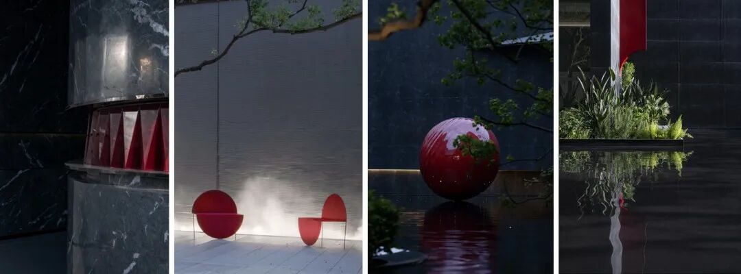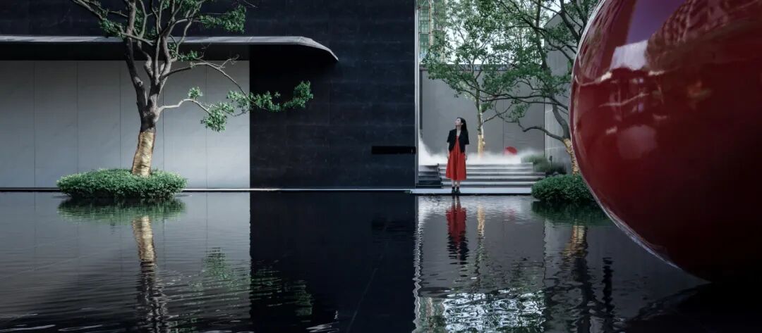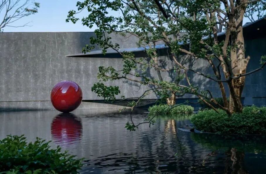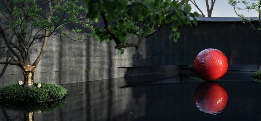 艺术馆的前厅我们设置了红色雕塑,两棵造型奇异的乌桕构建了舞台剧场式的氛围,形成一种象征化的符号。