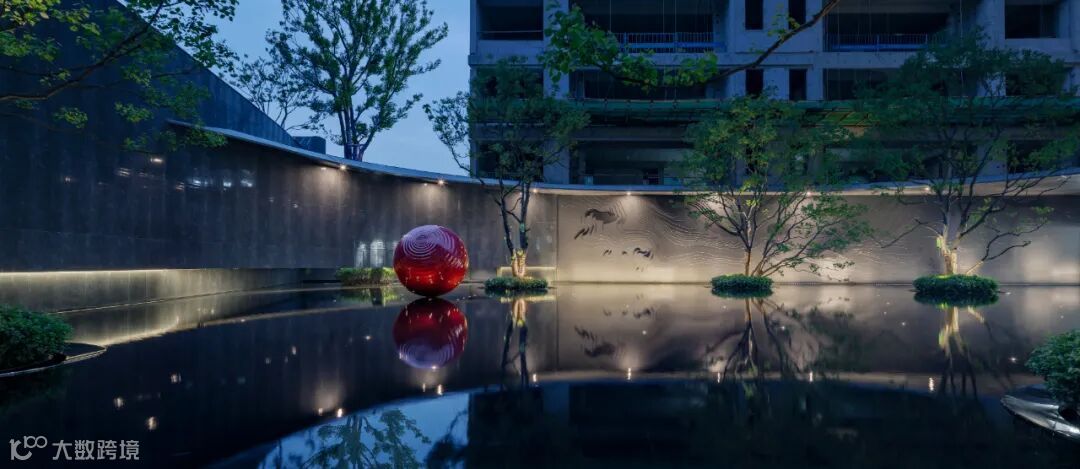 乌桕林疏影下的空间,墙面浮雕山景,对望一轮红日,以几何的形象凝缩成一幅“红日江山图”。